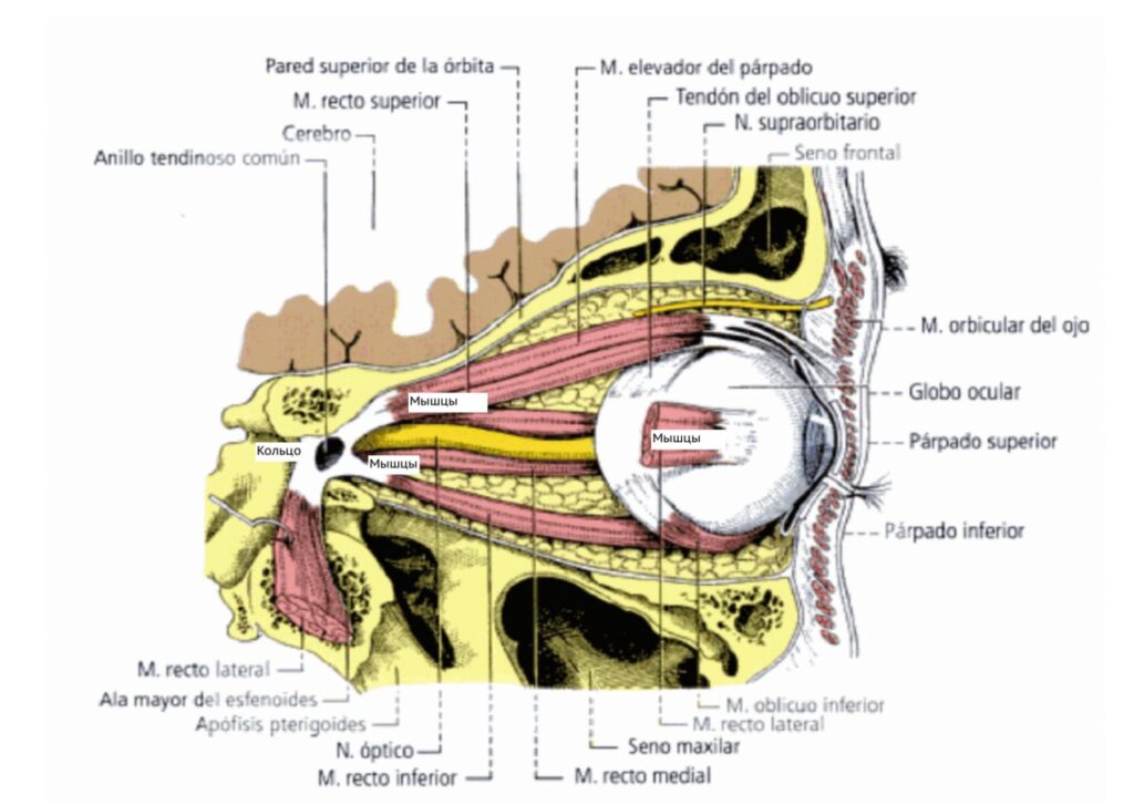 Как видите на картинке все эти мышцы прикрепляются к кольцу. Здесь также проходит зрительный нерв. Это кольцо имеет мощную связочную структуру, что в свою очередь покрывается твердой мозговой оболочкой. Таким образом напряжение из черепа, проблемы в черепе могут приводить к хроническому напряжению, следовательно возникает компрессия нерва, компрессия сосудов, что приводит к нарушению кровотока и иннервации глаза.